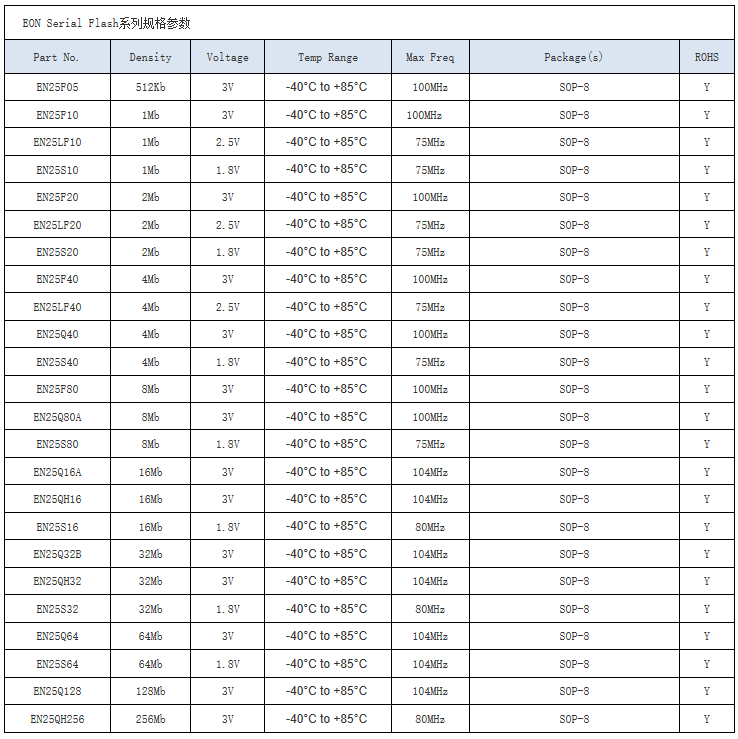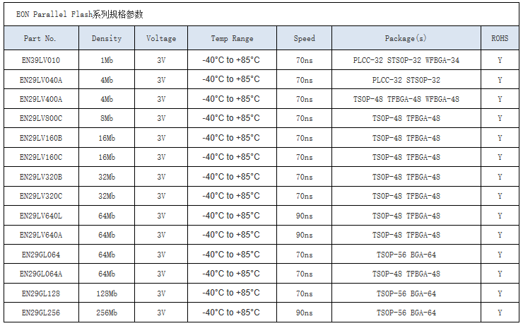 •产品线长 - Eon Serial/Parallel Flash产品提供512Kb - 256Mb 的密度、I2C、Microwire 和 Parallel 兼容协议