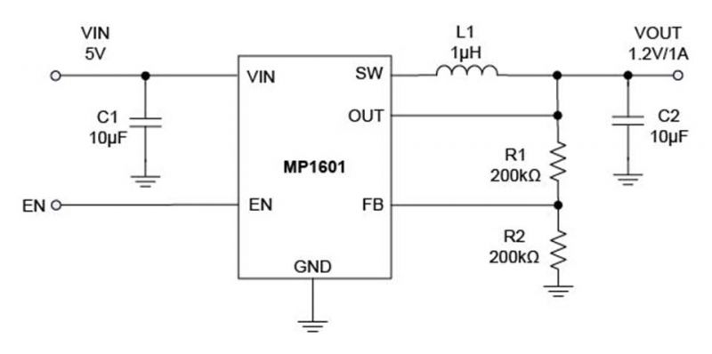 MP1601 是一款内置内部功率 MOSFETs 的单片降压开关转换器。在 2.3V 至 5.5V 输入电压范围内,MP1601 可实现 1A 的连续输出电流,具有极好的负载和线性调节性能。其输出电压可调节低至0.6V。