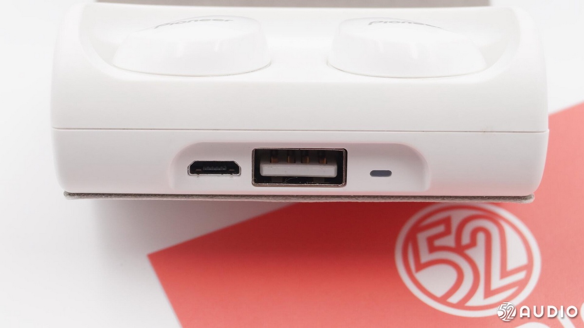 先锋这款蓝牙耳机的充电盒自带移动电源功能,配备了一个USB-A输出接口和一个Micro USB输入接口,在紧急情况下还可以给手机应急充电。