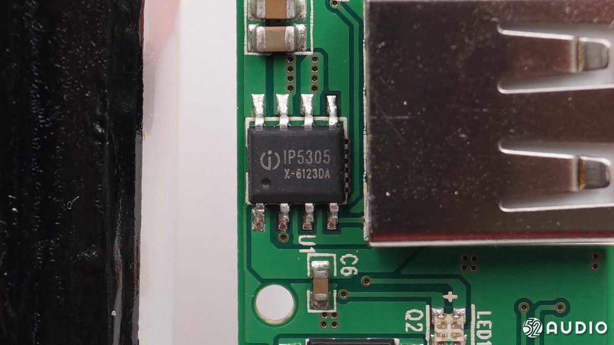 充电盒内部做工优良,电源管理方面的功能主要由一个英集芯的IP5305完成。IP5305这是英集芯专门为TWS蓝牙耳机充电盒设计的电源管理芯片,可监测到5mA级别电流,是一款集成升压转换器、锂电池充电管理、电池电量指示的多功能电源SOC。