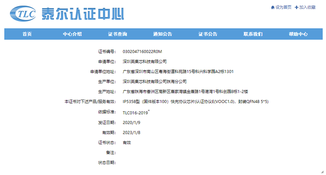 泰尔认证中心官网信息显示,英集芯IP5358(固件版本100)快充协议芯片于2020年1月9日正式获得VOOC1.0闪充认证,证书编号:0302047160022R0M,有效期为3年。