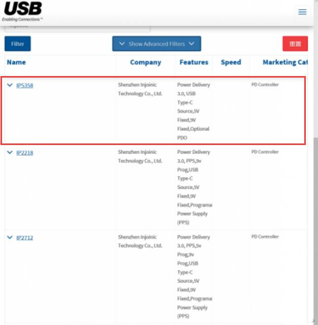 充电头网了解到,在通过OPPO VOOC闪充认证之前,英集芯IP5358就已经获得了USB PD3.0快充认证,在USB-IF协会官网可查询到认证TID号为2074。