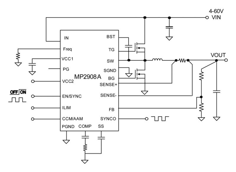 对于噪声敏感性应用,MP2908A 的工作频率可通过外部电阻设置或同步至外部时钟。全方位保护功能包括精确的输出过压保护(OVP)、输出过流保护(OCP)和过温保护。